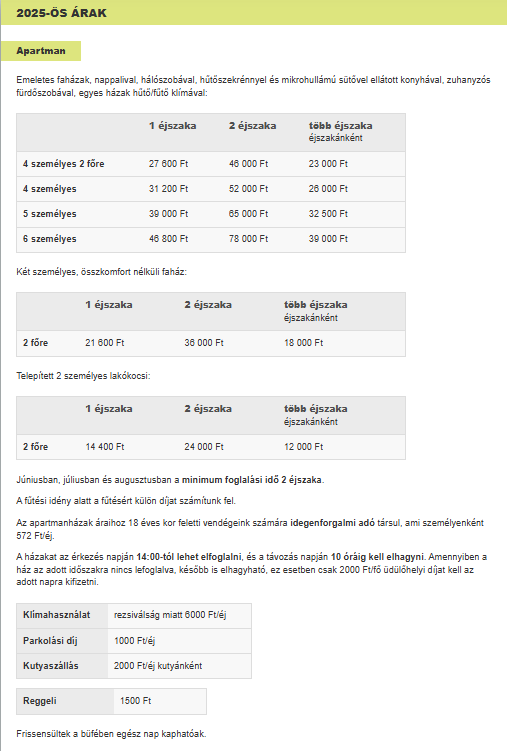 Négy, öt és hat ágyas faházak nappalival, konyhával, hűtőszekrénnyel, mikróval, indukciós főzőlappal és fürdőszobával