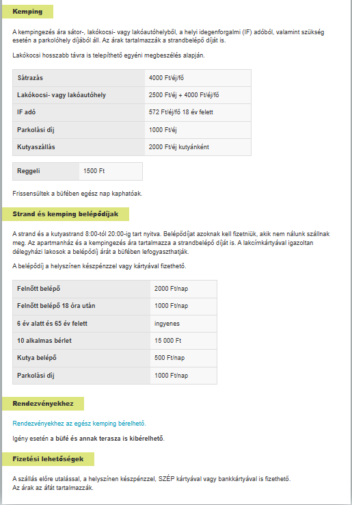 Sátorhelyek áramvételi lehetőséggel és közös zuhanyzóval